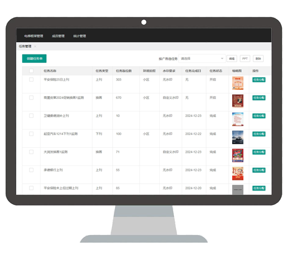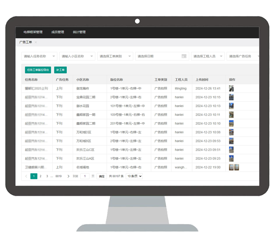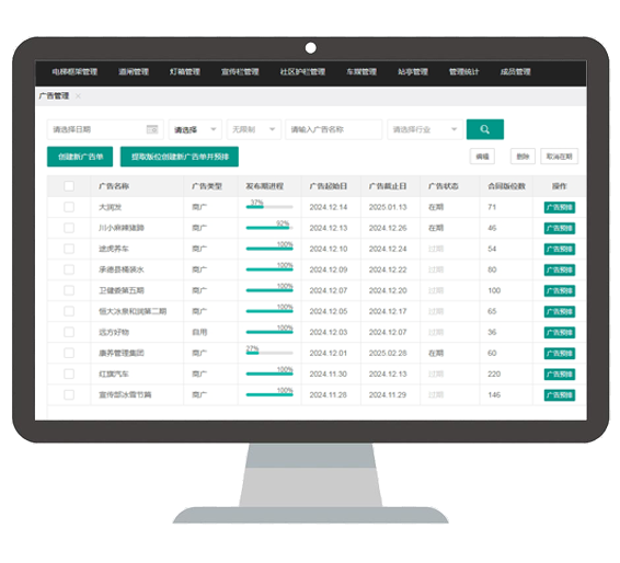 客户管理、物业管理、上刊率、绩效统计等多维度信息管理统计,全面高效展示广告、物业及工程绩效数据。